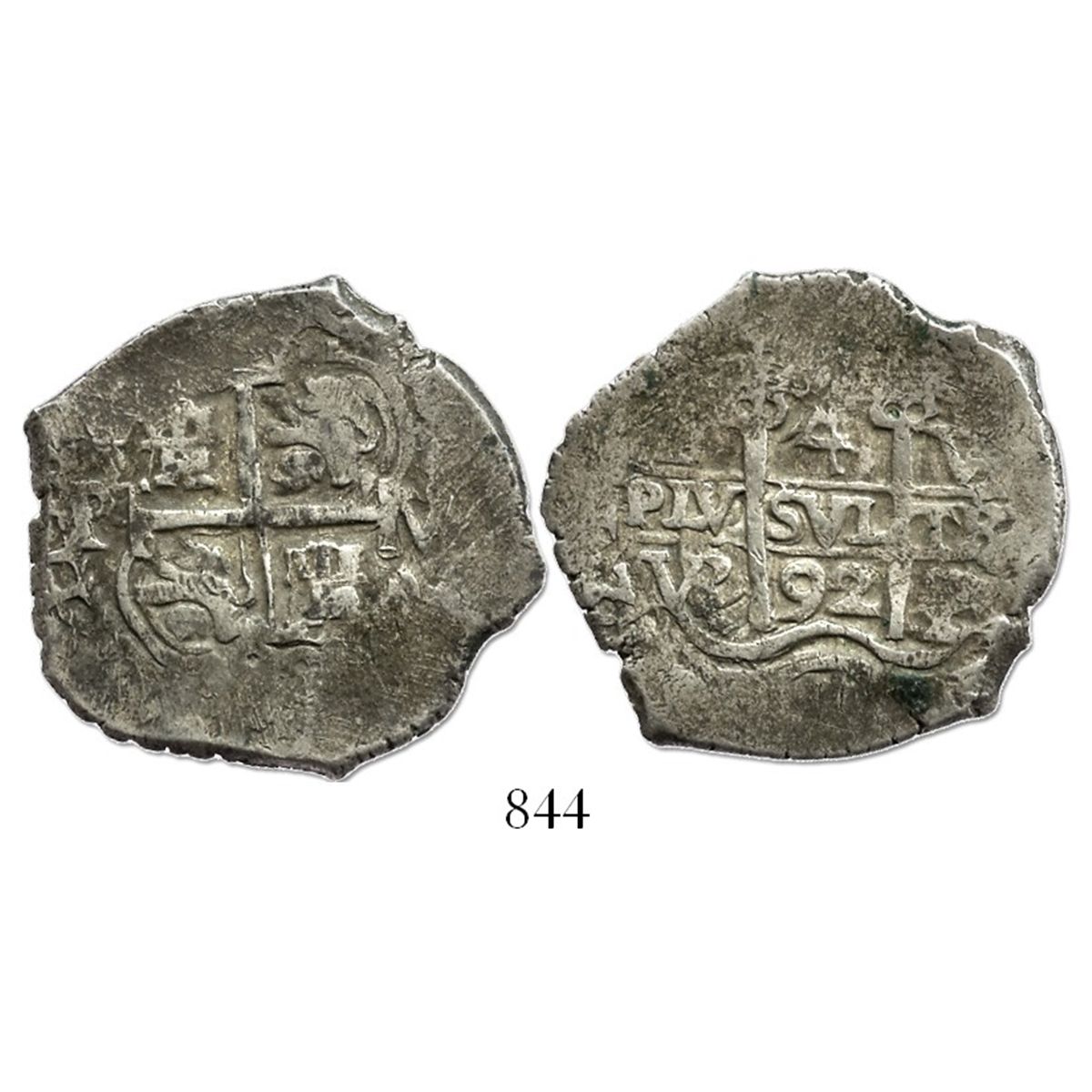 Potosi, Bolivia, cob 4 reales, 1692VR. S-P40; KM-25; CT-520. 13.9 grams. Nice and well-centered full pillars and cross, bold date plus final digit in legend, 3 assayers, richly toned VF.