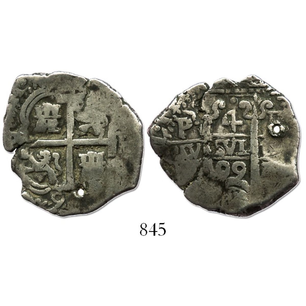 Potosi, Bolivia, cob 4 reales, 1699F, rare. S-P42; KM-25; CT-529. 12.3 grams. Two dates (missing in Sellschopp), good full cross, full pillars, nicely contrasting toning, Fine with edge-splits and hole at edge.