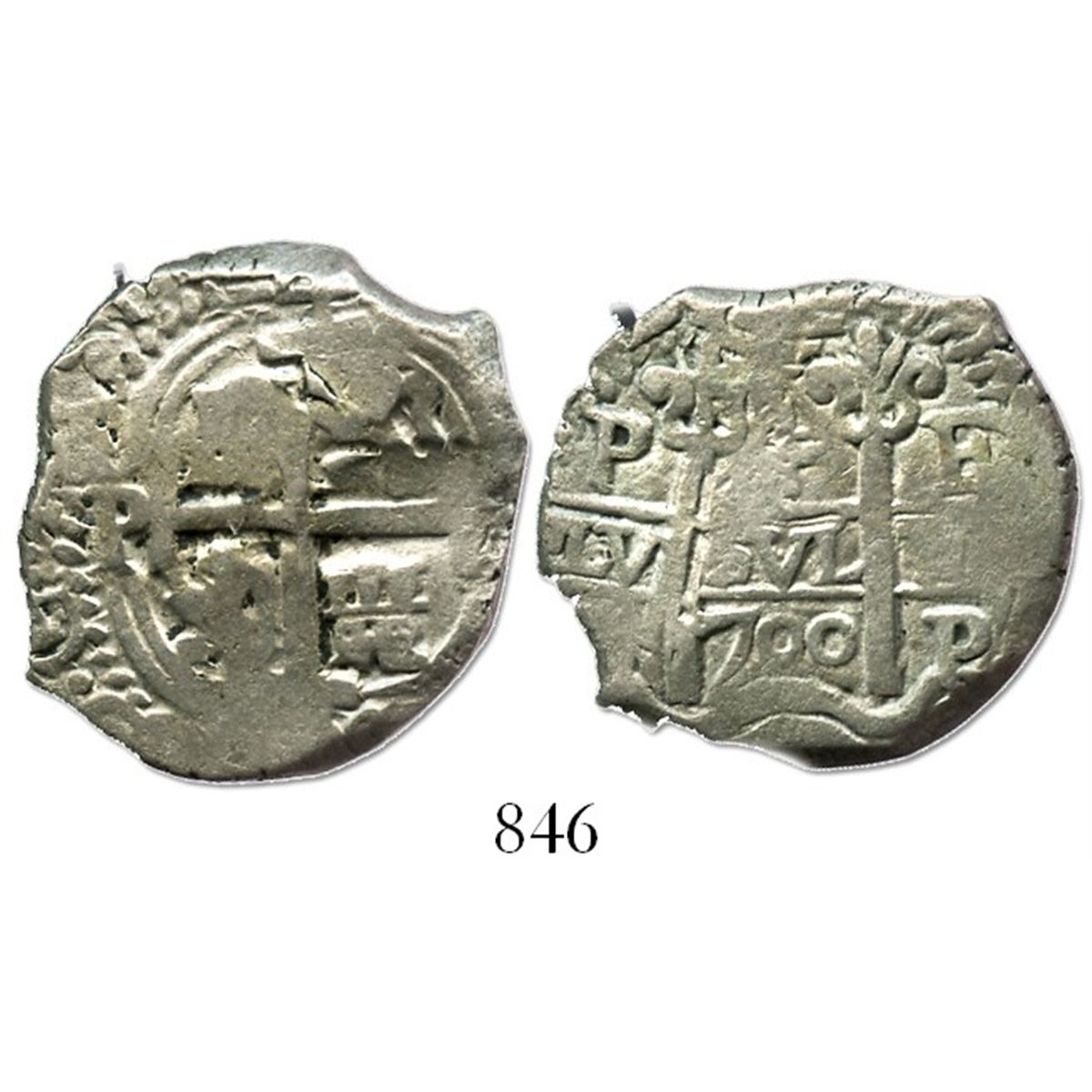 Potosi, Bolivia, cob 4 reales, 1700F, rare. S-P42; KM-25; CT-532. 12.3 grams. Compact flan with clear date (missing in Karon) between full pillars, clear assayer, 3 mintmarks, nearly full cross, low-contrast Fine+.