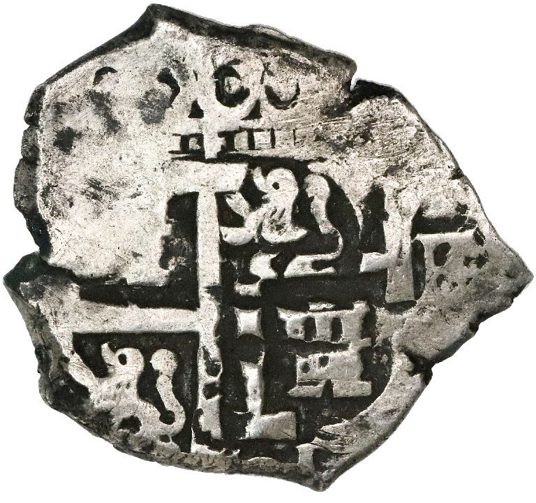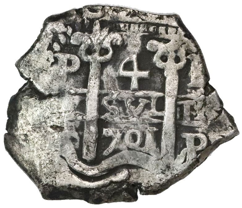 Potosi, Bolivia, cob 4 reales, 1701F, posthumous Charles II. S-P42; KM-25; Cal-550. 12.86 grams. Good full pillars and nearly full waves, full but double-struck cross, clear date and parts of all three assayers (scarce), VF with dark encrustation in crevices and slightly porous surfaces. Pedigreed to the Arturo Rosenheim collection.