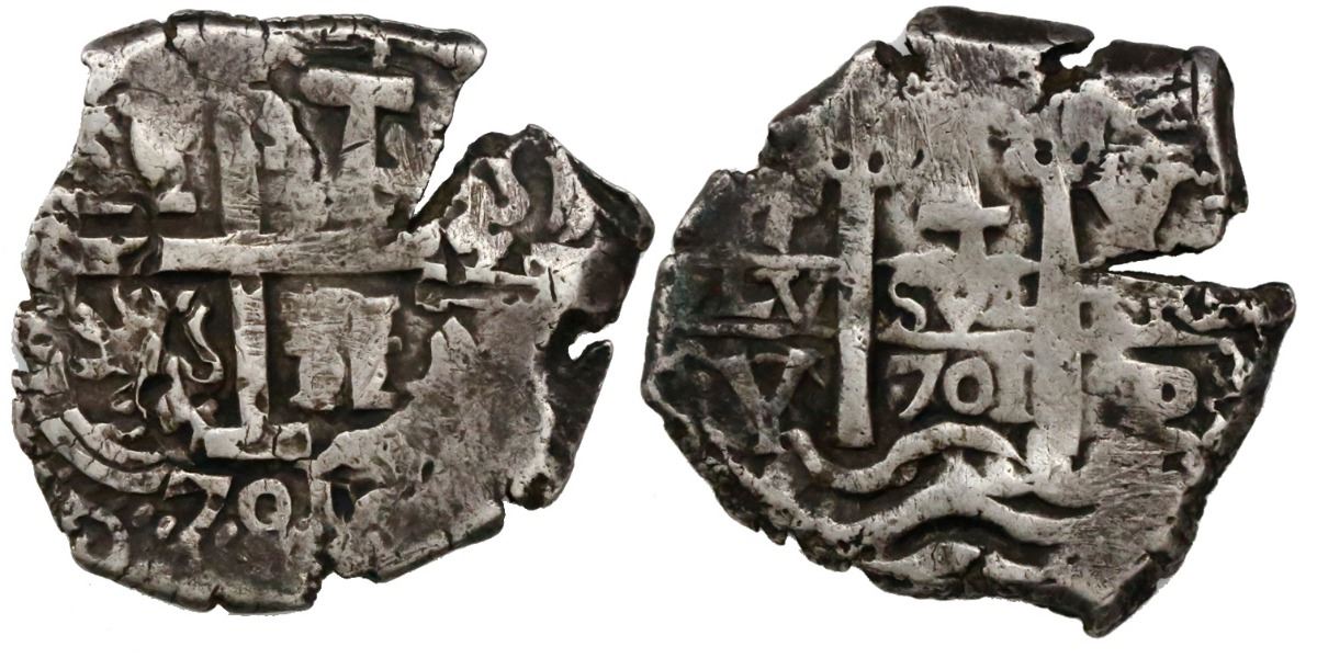 Potosi, Bolivia, cob 4 reales, 1701Y. S-P43; KM-25. 12.15 grams. Full pillars-and-waves, full but doubled cross, two dates and assayers, Fine with darkly toned fields, crude edge (as made) with split.