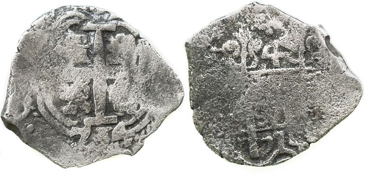 Potosi, Bolivia, cob 4 reales, 1714Y. S-P43a; KM-30; CT-1095. 11.4 grams. Full date below cross, second date at bottom of pillars, but otherwise quite flat (as struck), lightly corroded, toned on fields. Recovered from: Princess Louisa, sunk in 1743 off the Cape Verde Islands, west of Africa
