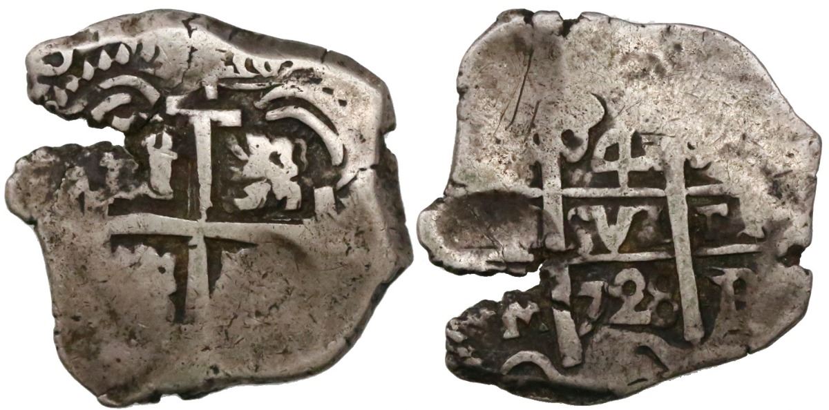 Potosi, Bolivia, cob 4 reales, 1728M. S-P44; KM-30; CT-1108. 13.43 grams. Bold full cross and pillars but peripherally flat, well-toned Fine+ with large edge-crack.