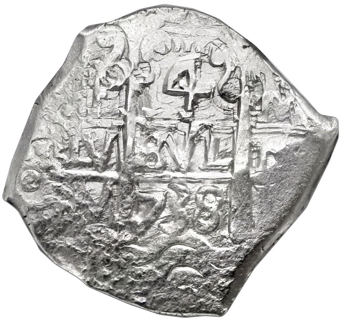 Potosi, Bolivia, cob 4 reales, 1738 M, NGC MS 62 ("top pop"). S-P47; KM-30a; Cal-1193. 12.96 grams. Completely white with luster and lack of toning (pristine), with full cross and pillars despite its typically chunky flan, three dates and assayers, typical surface roughness on opposing sides, tied with one other for finest in the NGC census.
