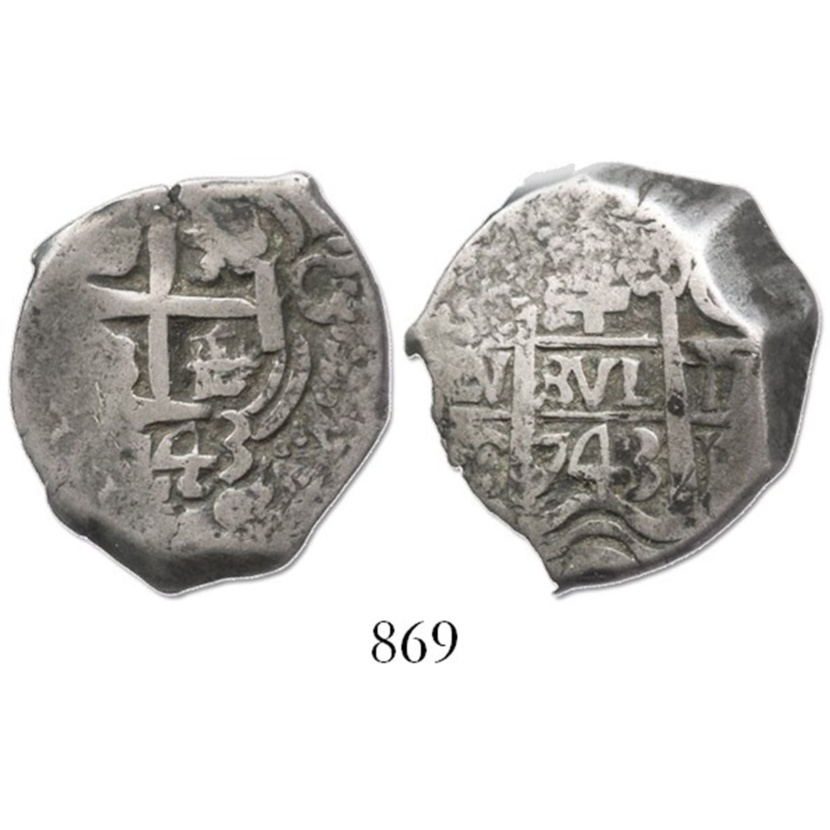 Potosi, Bolivia, cob 4 reales, 1743C. S-P49; KM-30a; CT-1128. 13.0 grams. Two bold dates, 1-1/2 assayers, good but off-center cross, well-centered pillars-and-waves, richly toned AVF.
