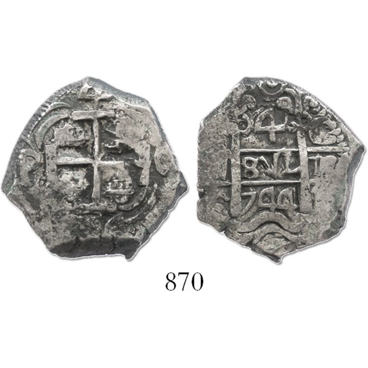 Potosi, Bolivia, cob 4 reales, 1744C. S-P49; KM-30a; CT-1129. 13.7 grams. Well-centered strike with nice full pillars-and-waves and cross, 2 dates and parts of all 3 assayers, XF with patchy toning.