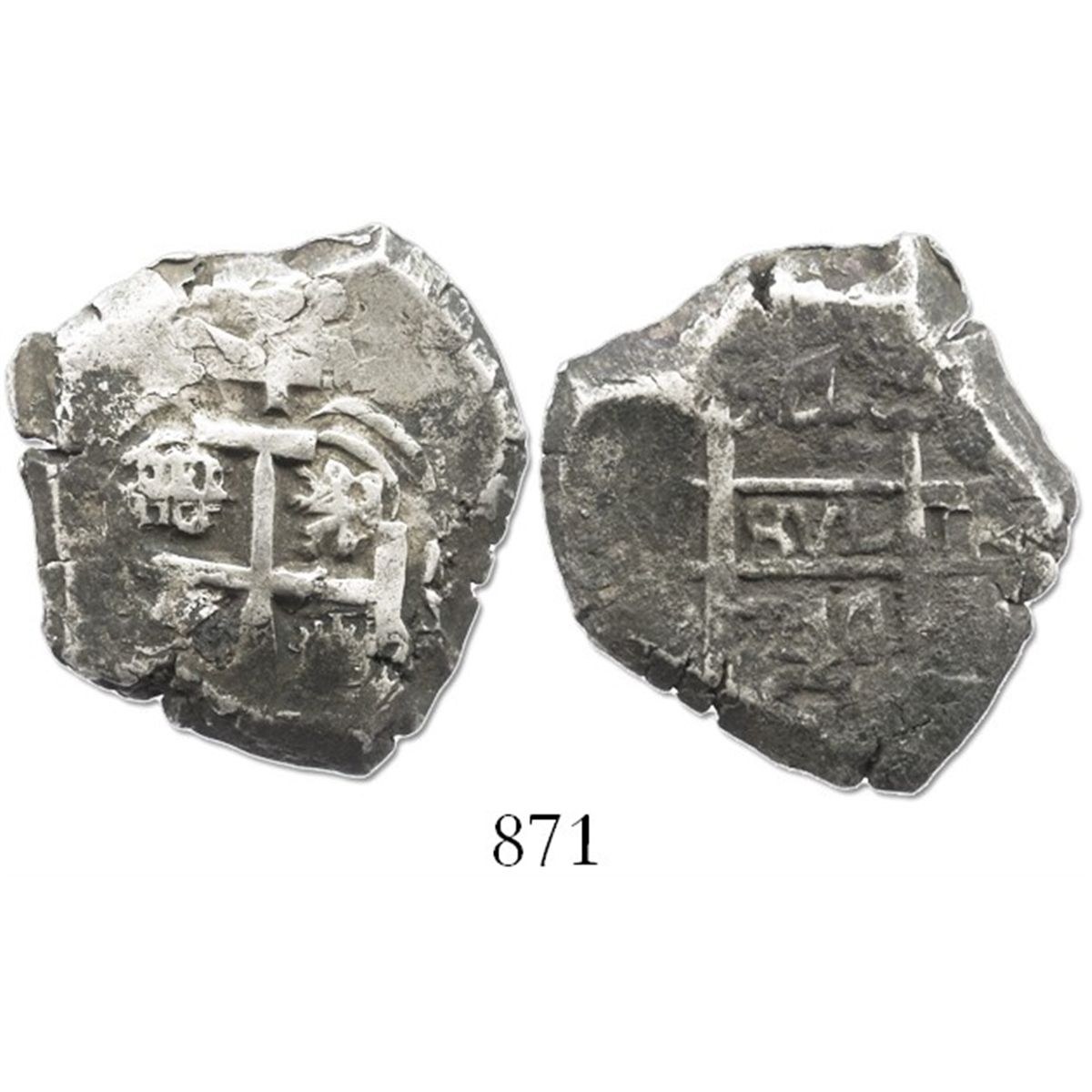 Potosi, Bolivia, cob 4 reales, 1744C. S-P49; KM-30a; CT-1129. 13.0 grams. Good but off-center cross, clear date between well-centered pillars, VF with mostly dark toning.