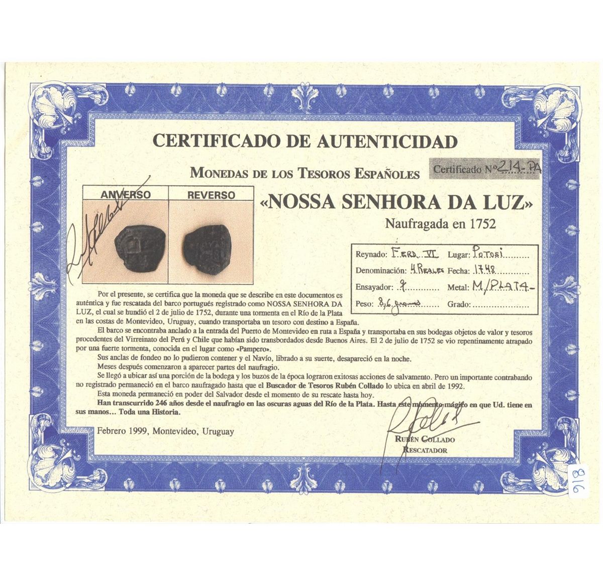 Potosi, Bolivia, cob 4 reales, 1748q. S-P50a; KM-39; CT-435. 8.6 grams. Darkly toned and somewhat corroded but with full inner details (pillars and cross), bold date, 2 assayers. With photo-certificate #214-PA from salvager Ruben Collado (hand-signed). Recovered from: Luz, sunk in 1752 off Montevideo, Uruguay