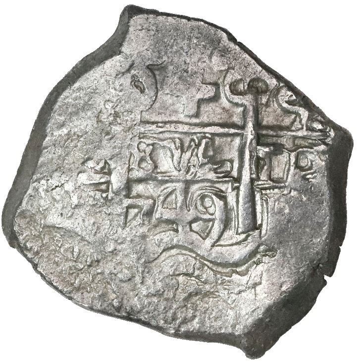 Potosi, Bolivia, cob 4 reales, 1749q. S-P50a; KM-39; Cal-400. 13.65 grams. Broad but chunky flan with one choice full pillar, , nearly full cross, two full dates, non-toned AU with areas of slight surface roughness (as made). Pedigreed to the Arturo Rosenheim collection.