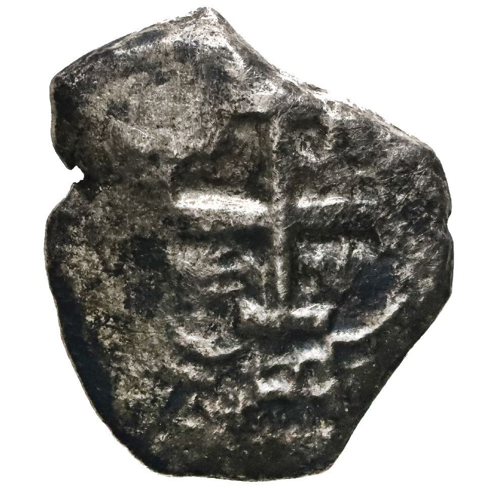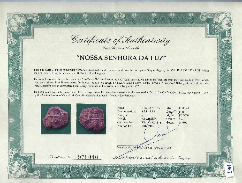 Potosi, Bolivia, cob 4 reales, 1751q/E, rare. S-P52; KM-39; Cal-unl. 9.43 grams. Corroded yet solid coin with all three digits in pillars side date visible, clear overassayer (unlisted in Calico) next to a bold full cross, mottled dark toning. With original photo-certificate from Uruguay. From: Luz, sunk in 1752 off Montevideo, Uruguay