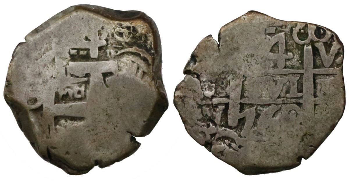 Potosi, Bolivia, cob 4 reales, 1760V-Y. S-P57; KM-44; CT-1153. 12.91 grams. Chunky flan with lots of flatness but both pillars-side assayers full and two partial dates on that side, lightly toned AVG.