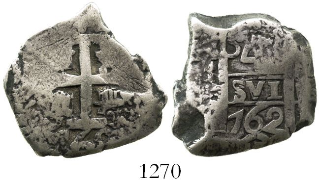Potosi, Bolivia, cob 4 reales, 1762(V-Y). S-P57; KM-44; CT-1155. 13.3 grams. Squarish flan with one sharp point, bold date, decent cross with partial second date below, nicely toned Fine.