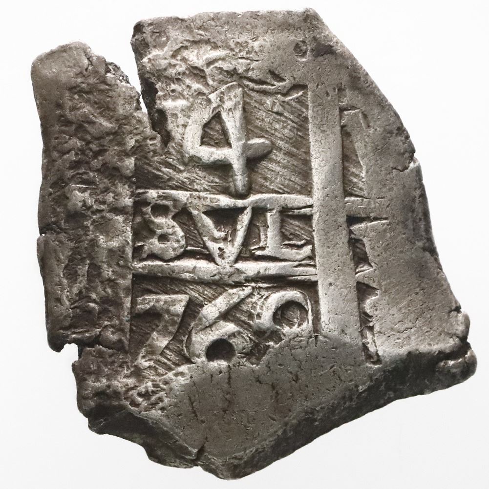 Potosi, Bolivia, cob 4 reales, 1762V-(Y). S-P57; KM-44; Cal-906. 13.39 grams. Darkly toned XF, crudely struck parts but well detailed in other areas with even some die polish lines visible between the pillars, irregular flan with several edge cracks. Pedigreed to the Arturo Rosenheim collection.