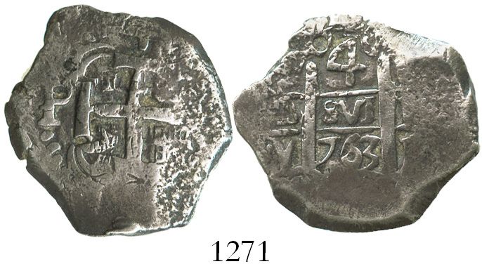 Potosi, Bolivia, cob 4 reales, 1763(V)-Y. S-P57; KM-44; CT-1156. 13.5 grams. Odd-shaped flan with much peripheral flatness but full pillars with clear date and assayer, full cross with bold mintmark, toned AVF.