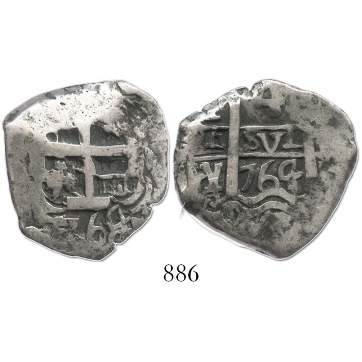 Potosi, Bolivia, cob 4 reales, 1764(V)-Y. S-P57; KM-44; CT-1157. 12.9 grams. Two bold dates, full assayer Y, Fine+ with darkly toned fields (nice contrast).