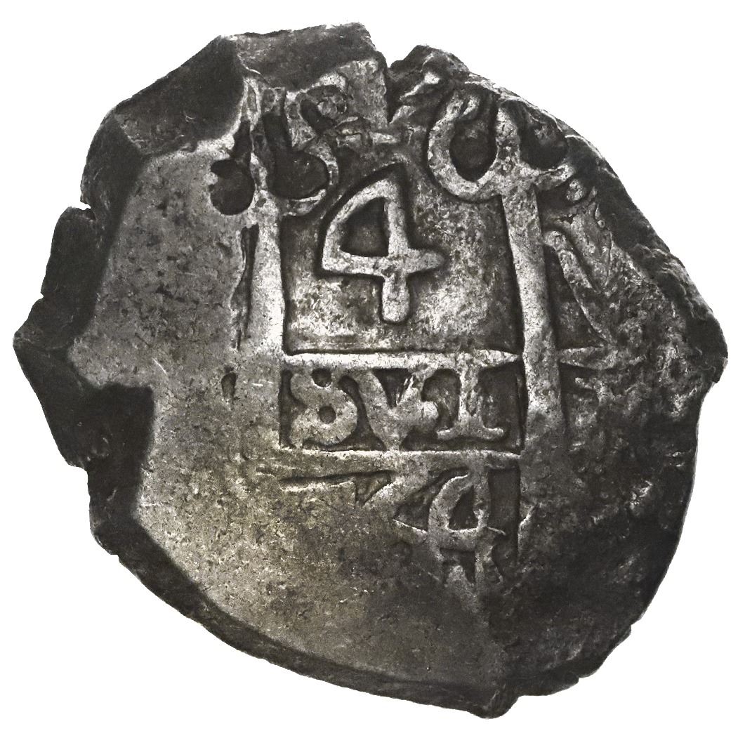 Potosi, Bolivia, cob 4 reales, 1764V-(Y). S-P57; KM-44; Cal-908. 13.38 grams. XF with a bit of a crude strike but some bold partial pillar and cross detail plus two dates visible, some tan sediment in crevices. Pedigreed to the Arturo Rosenheim collection.