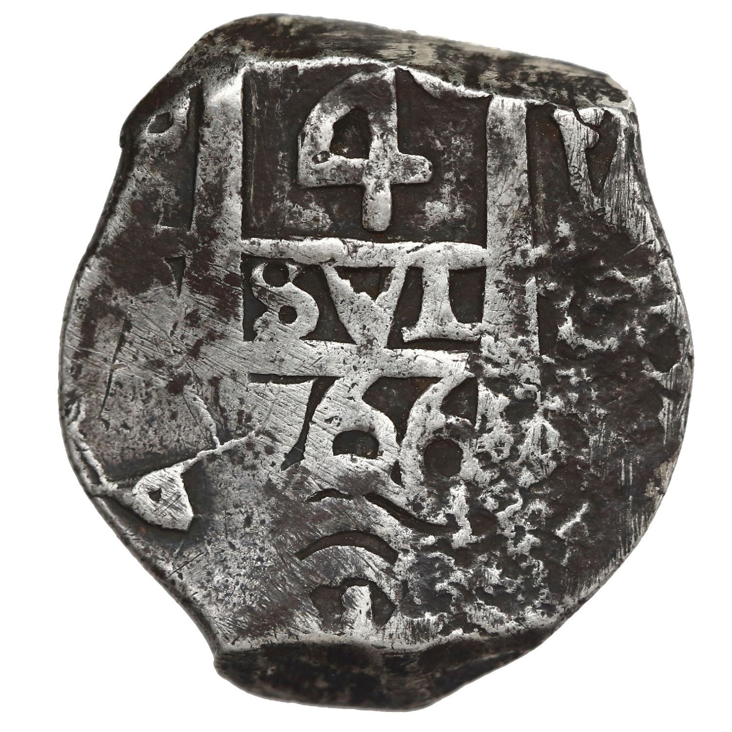 Potosi, Bolivia, cob 4 reales, 1766 V-(Y). S-P57; KM-44; Cal-910. 13.37 grams. darkly toned VF with some scratches and a few unusual planchet flaws, bold date between pillars.