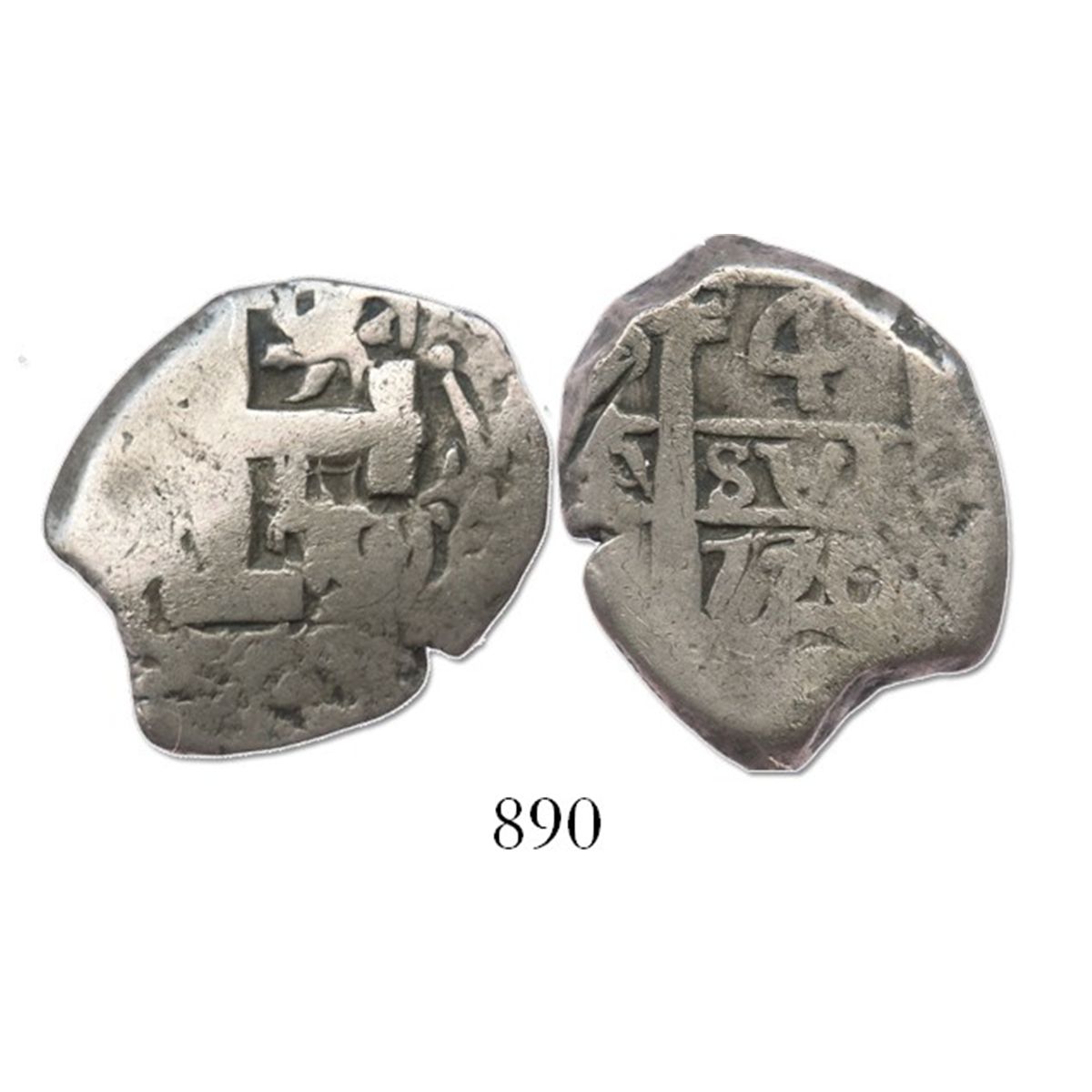 Potosi, Bolivia, cob 4 reales, 1770/69V-Y, very rare. S-P57; KM-unl (44); CT-unl. 13.2 grams. Full date with clear overdate (missing in Sellschopp and Karon, and only the second one we have seen), oversized and off-center cross with bold assayer V to right, Fine with contrasting toning.