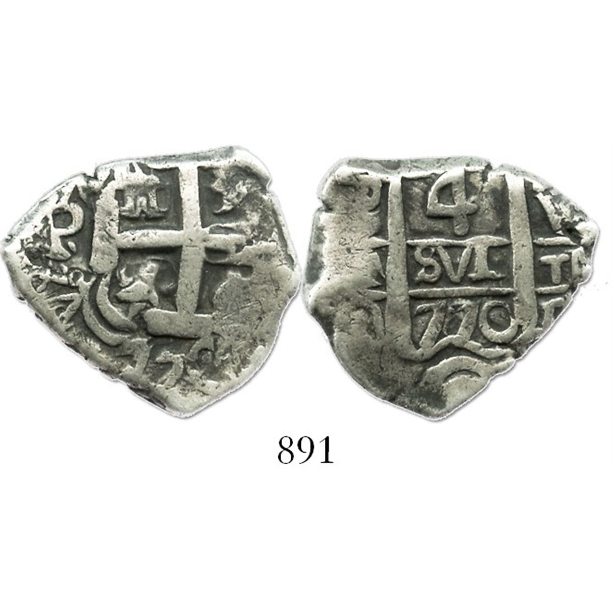 Potosi, Bolivia, cob 4 reales, 1770V-(Y). S-P57; KM-44; CT-1163. 13.3 grams. Choice bold details all over (pillars, cross, 2 dates), and attractively toned, VF, significantly scarcer than the 1760s dates.