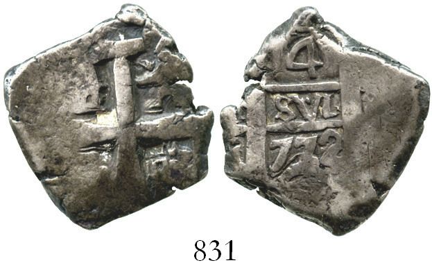 Potosi, Bolivia, cob 4 reales, 1772(V)-Y. S-P59; KM-44; CT-1165. 13.3 grams. Chunky, squarish flan with bold denomination and clear date, lightly toned AVF.