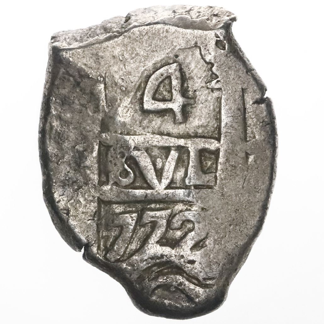 Potosi, Bolivia, cob 4 reales, 1772(V-Y). S-P59; KM-44; Cal-918. 13.43 grams. XF piece struck on a thick, oblong planchet with bold denomination and full date between pillars, cross side lightly corroded from burial. Pedigreed to the Arturo Rosenheim collection.