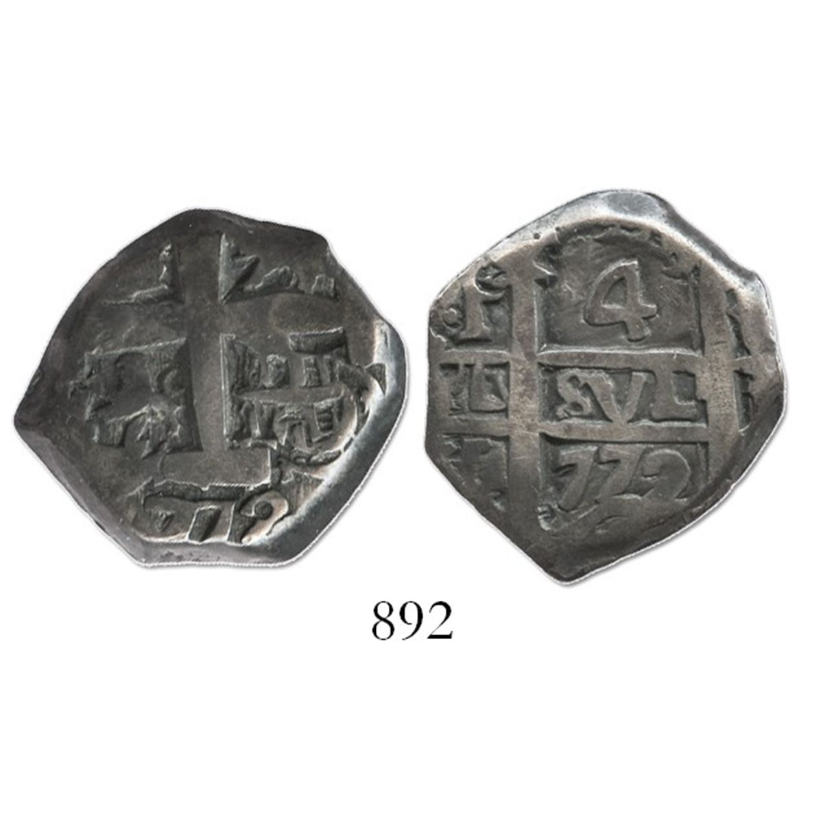 Potosi, Bolivia, cob 4 reales, 1772V-Y. S-P57; KM-44; CT-1165. 13.2 grams. Beautifully old-toned VF on a typically fat and chunky flan with good details, including 2 dates and an oversized cross.