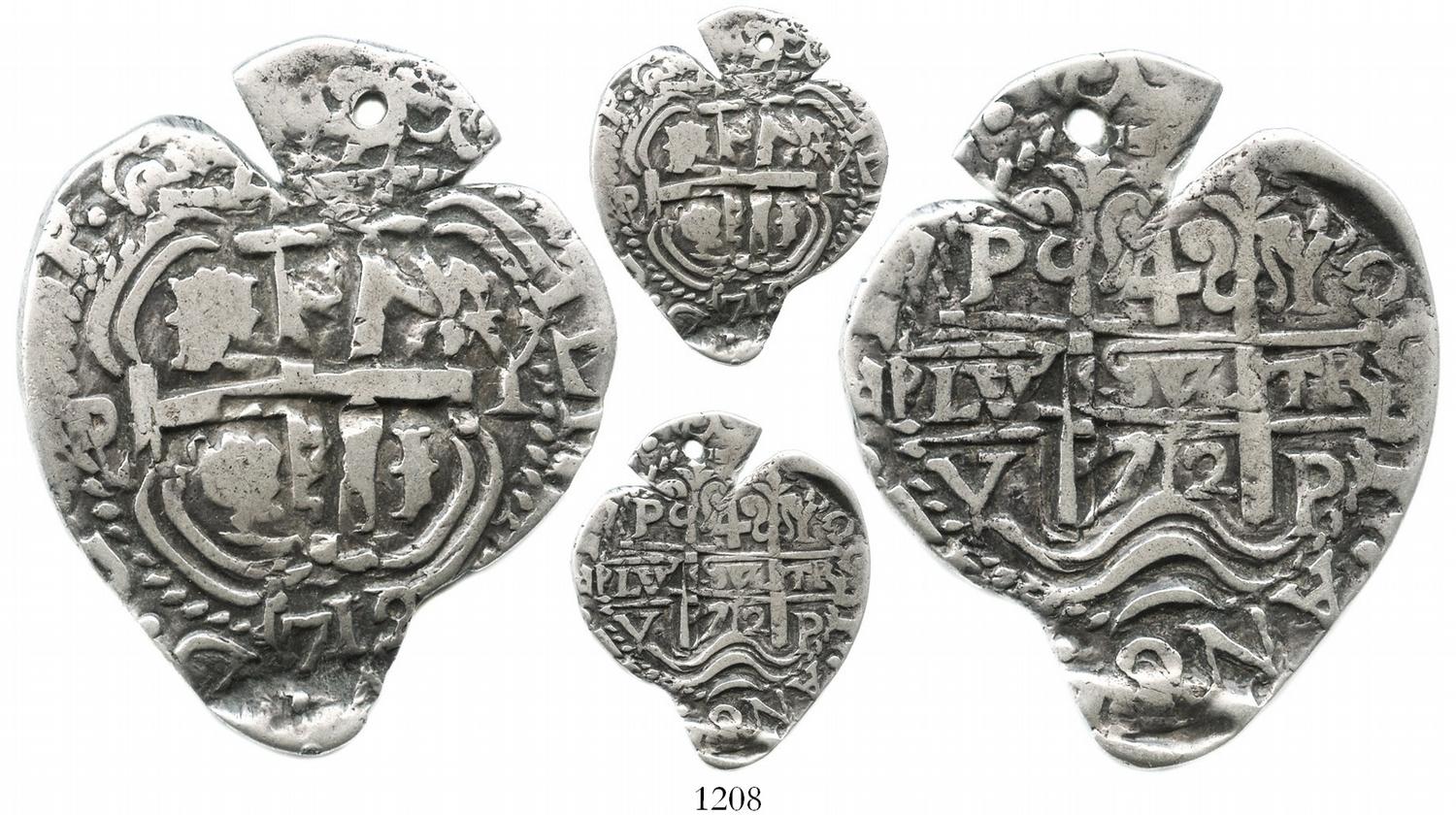 Potosi, Bolivia, cob 4 reales Heart, 1712Y, extremely rare. S-P43a; KM-unl. (cf. 30 for regular issue); CT-unl. (Type 181). 13.2 grams. Classic "corazon" shape with aligned medallic axes, full inner details and some legend, 2 dates (full 1712 below cross), attractively toned AVF with tiny hole in stem at top as usual, full weight, the cross doubled but the pillars side quite nice. Four-reales Hearts are so rare as a type that discussion of known dates is practically irrelevant (but note that this auction uniquely features the same date in 2R and 1R Hearts among the following lots), meriting the following description by Freeman Craig in the Paul Karon Collection catalog (Ponterio, March 17, 1990): "the elusive denomination most sought by 'aficionados' of this mysterious and alluring series."