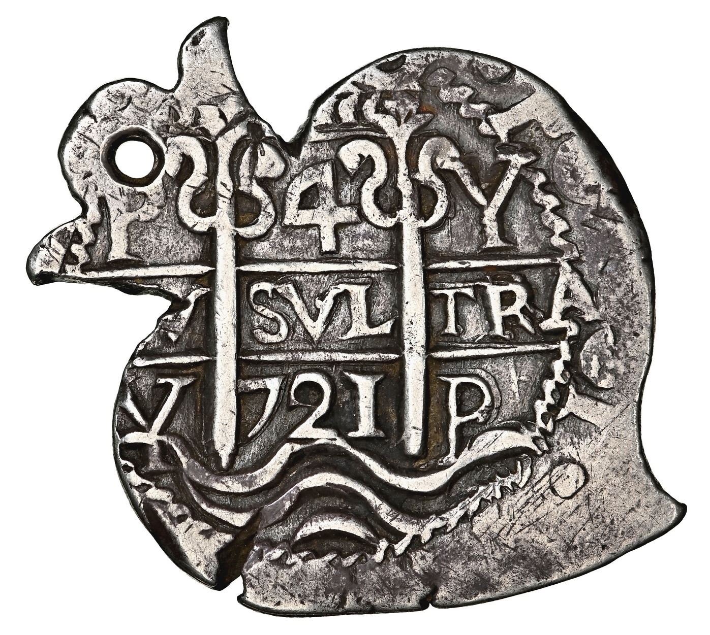 Potosi, Bolivia, cob 4 reales Heart, 1721 Y, unique, NGC XF 45, Practical Book of Cobs Plate Coin, Janson Plate Coin. Janson-C34.21; S-P43a; KM-unl; Cal-1148. 15.22 grams. A truly lovely coin, deeply struck and beautifully toned, precisely and intentionally oriented at a 45-degree angle with the axis of its otherwise classic Heart shape (perhaps to present the cross as an X instead), enabling two dates and all three mintmarks and assayers to be visible, neatly holed in the stem. Like all 4R Hearts known to us, this date is unique. Described in the Ponterio catalog as "quite possibly the finest heart shaped 4 Reales in existence," it is easy to see why it was chosen as plate coin for the type in both Sedwick and Janson. NGC #6284687-003. Plated on page 110 of Janson's La Moneda Circulante En El Territorio Argentino 1584-2019 (2020) and on pages 88 and 113 respectively of the 2nd (1990) and 3rd (1995) editions of Sedwick's The Practical Book of Cobs, and pedigreed to the Ponterio auction of March 1992 (lot 809) and the Swiss Bank Corp. auction of September 1997 (lot 2026).