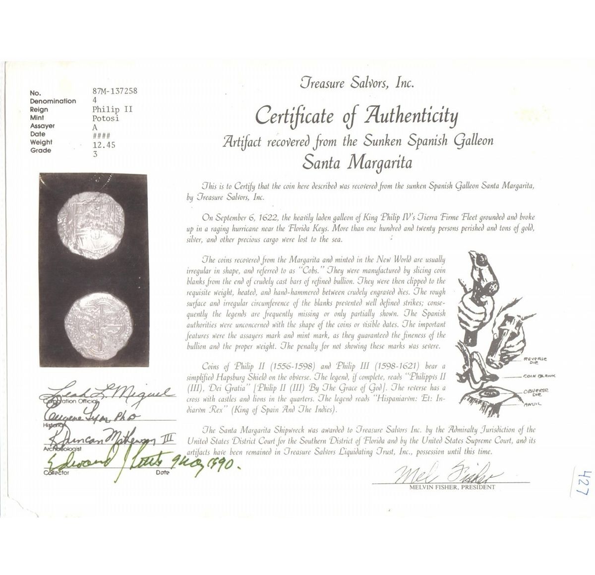 Potosi, Bolivia, cob 4 reales, Philip II, assayer B (3rd period), Grade 3, with Edward J. Little signature on certificate. S-P10; KM-4.2. 12.4 grams. Broad flan with well-detailed full shield and cross, bold mintmark but assayer (which certificate erroneously calls assayer A) among a few spots of corrosion, pedigreed to the cartographer who pinpointed the "mother lode" in 1985. With Fisher photo-certificate #87M-137258, and pedigreed to the Edward J. Little collection. Recovered from: Santa Margarita, sunk in 1622 west of Key West, Florida