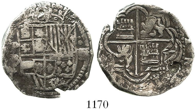 Potosi, Bolivia, cob 4 reales, Philip II, assayer B (5th period). S-P14. 13.4 grams. Bold full shield and cross, Fine with deep toning on fields, large punchmark outside cross and part of edge crude.