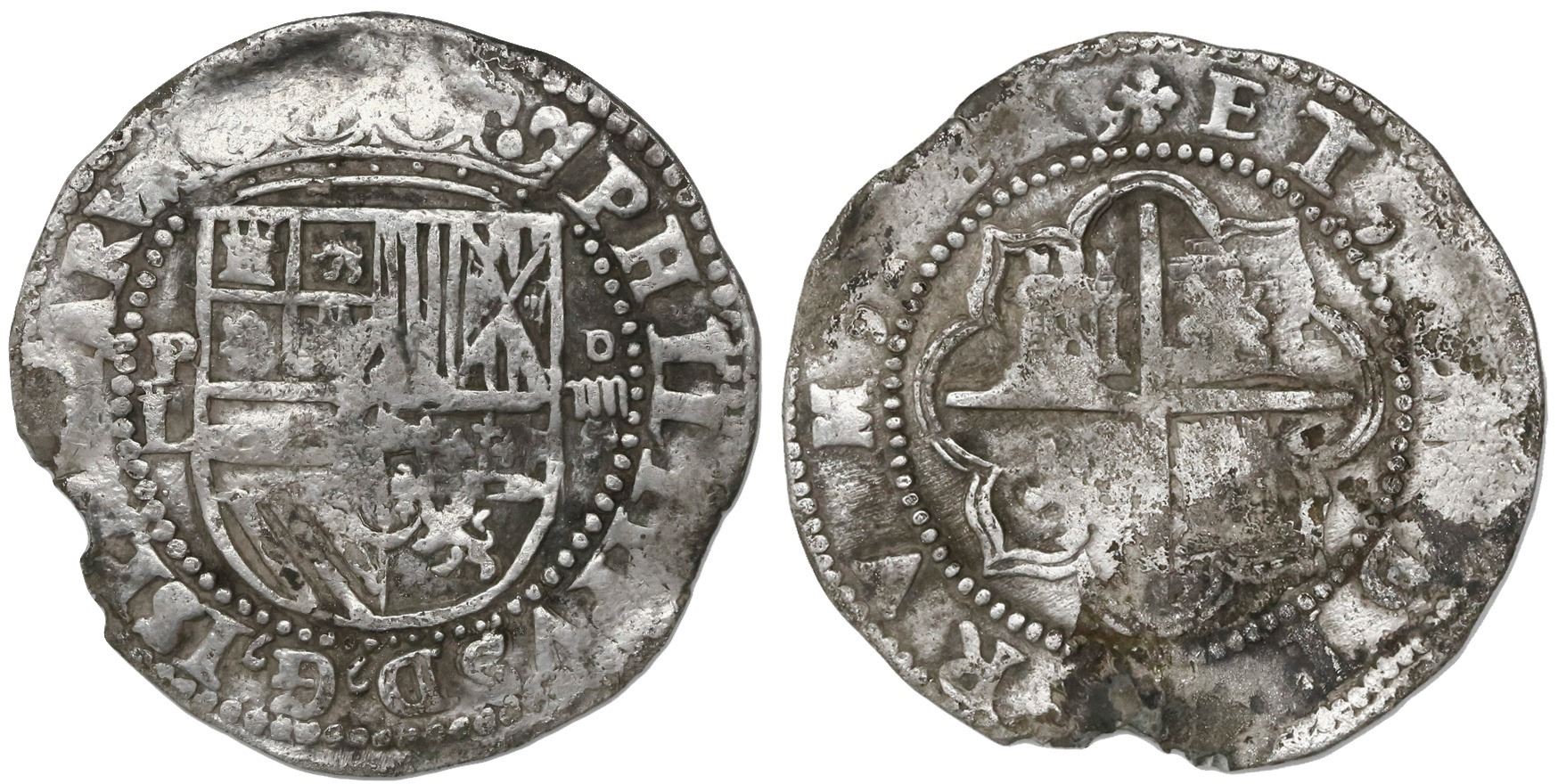 Potosi, Bolivia cob 4 reales, Philip II, assayer L (1st period), with P-L over denomination ii to left and ii over P-M to right, rare, ex-Yucatan wreck. S-P3; KM-4.2. 12.09 grams. Choice broad flan with nearly full legends, full and well-detailed shield with bold P-L to left and o-iiii to right (both with clear under-details), full but weaker cross with only light surface porosity, otherwise AVF with patchy toning. From an unidentified ca.-1590 wreck off the Yucatan peninsula of Mexico.