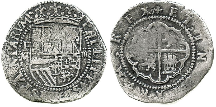 Potosi, Bolivia, cob 4 reales, Philip II, assayer M to left, rare. S-P2; KM-4.2; CT-323. 13.1 grams. Exceptionally broad flan with full and bold legends and crown (very well detailed), full inner details too, the P-M quite clear, all nicely toned and no worse than AVF but with some weak areas, still an impressive example of this rare second-assayer issue, whose neat style has perpetuated the Sellschopp myth that these coins were struck at Lima (proven wrong by documentation), per Calico and some other references. Advanced collectors will want to note that this specimen has the earliest style of lions (not the "flat" lions that came next), which are usually seen on examples with P-M to right (and with smaller M).