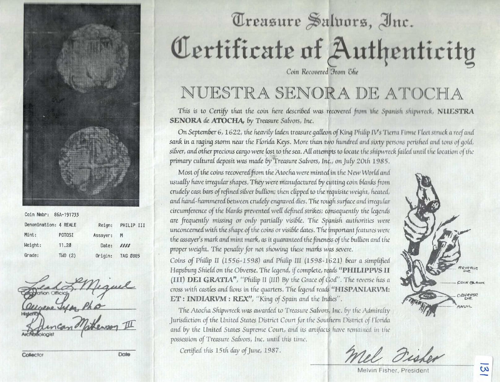 Potosi, Bolivia, cob 4 reales, Philip III, assayer M, Grade 2. S-P18; KM-9; Cal-771. 11.27 grams. Nearly full shield and cross with clear REX in legend where date would appear in later issues, light surface corrosion, cracked flan (as made). With Fisher tag and certificate 191733. Recovered from: Atocha, sunk in 1622 west of Key West, Florida