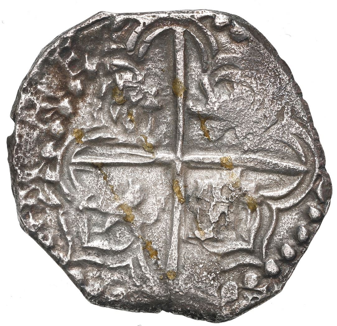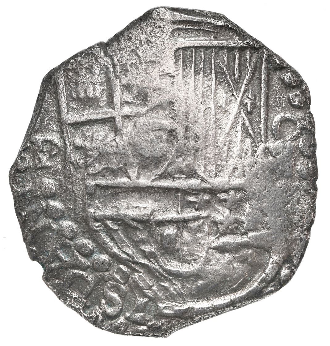 Potosi, Bolivia, cob 4 reales, Philip III, assayer Q, Grade 1. S-P17; KM-9; Cal-770. 12.39 grams. Solid coin with good full cross and shield, practically no corrosion, lightly toned, the assayer barely visible due to minor localized doubling. With Fisher photo-certificate 85A-261725 (tag missing). From: Atocha, sunk in 1622 west of Key West, Florida