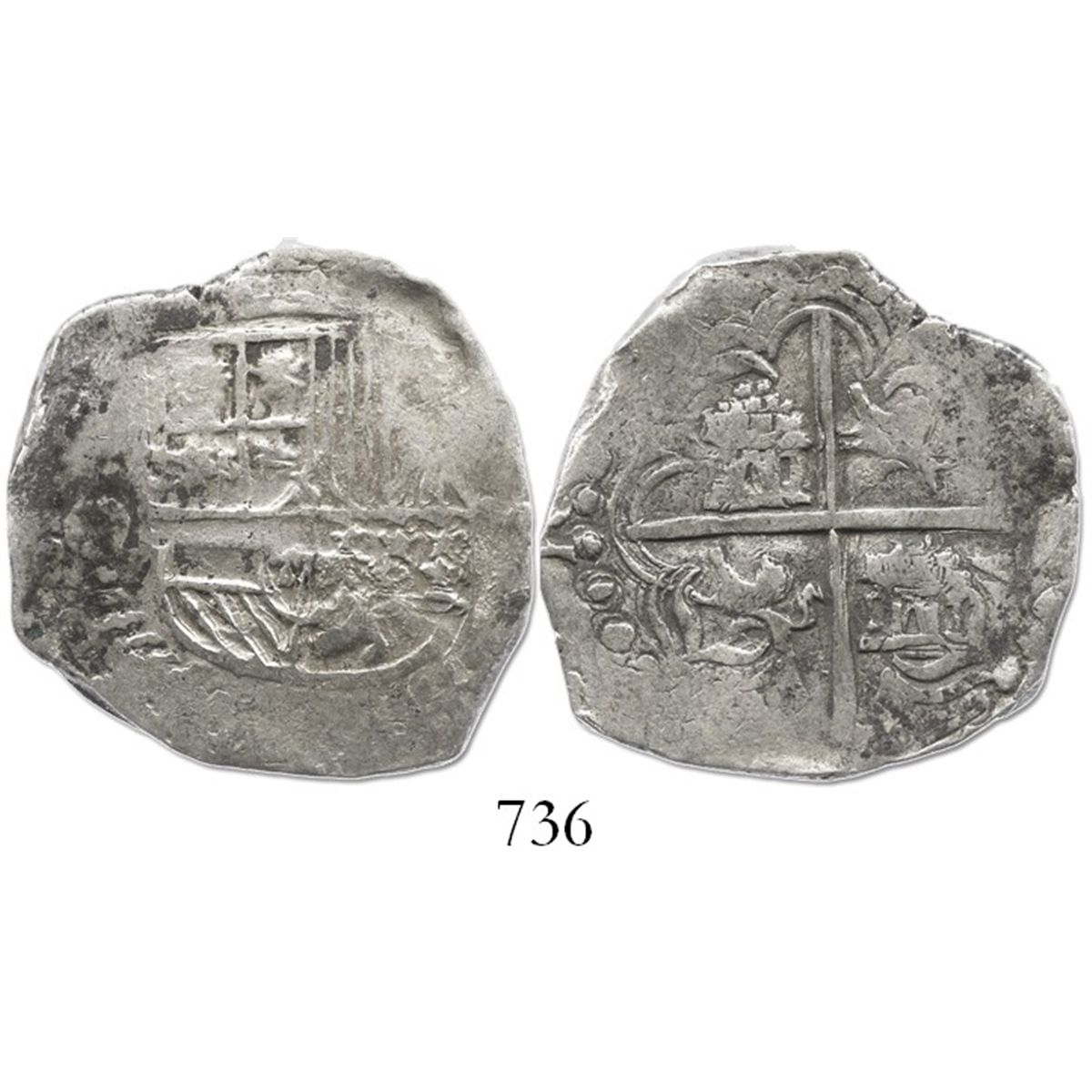 Potosi, Bolivia, cob 4 reales, Philip III, assayer Q. S-P17; KM-9; CT-243. 13.5 grams. Bold full cross, full shield, slightly crude shape and uneven thickness, AVF with patchy toning.