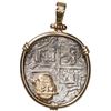 Potosi, Bolivia, cob 4 reales, Philip III, assayer R (curved leg), Grade 2, ex-Atocha (1622), mounted cross-side out in 14K gold bezel with pirate-face embellishment and shackle bail. 17.71 grams total. Full cross, weaker shield due to corrosion, silvery in color, sturdy gold bezel. From the Atocha (1622), with Fisher tag and certificate 263784.