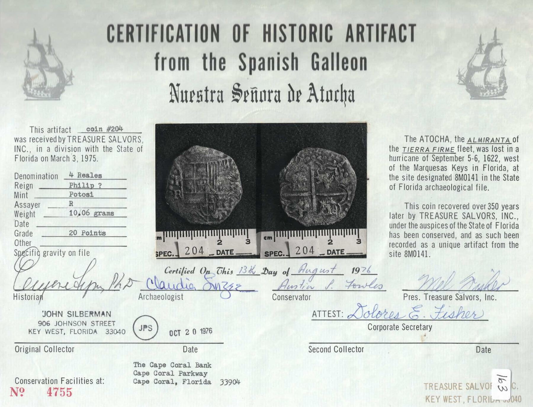 Potosi, Bolivia, cob 4 reales, Philip III, assayer RL (curved leg), Grade 2 (20 points), with hand-signed certificate from 1976. S-P15; KM-9; Cal-768. 10.06 grams. Bold full P-RL, full shield and cross (the latter bolder), moderately corroded and darkly toned, desirable pre-"Mother Lode" certificate. With original Fisher cardboard holder and photo-certificate 204 from 1976 (Cape Coral Bank), hand-signed by Eugene Lyon, Claudia Singer, Austin Fowles, Mel and Dolores (Deo) Fisher, pedigreed to the J.P. Silberman Estate.Recovered from: Atocha, sunk in 1622 west of Key West, Florida.