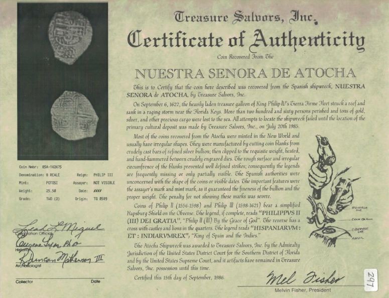 Potosi, Bolivia, cob 4 reales, Philip III, assayer T, Grade 2. S-P21; KM-9. 12.79 grams. Well-detailed full shield and nice full cross-lions-castles on a somewhat oblong flan, minimal surface corrosion. With Fisher tag and certificate #142475 (mis-attributed to 8R and with incorrect weight). Recovered from: Atocha, sunk in 1622 west of Key West, Florida