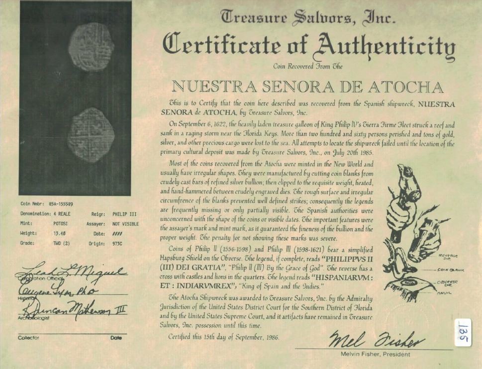 Potosi, Bolivia, cob 4 reales, Philip III, assayer not visible, Grade 1. KM-9. 13.36 grams. Bold full shield and cross-lions-castles, no corrosion, contrasting toning in crevices. With Fisher tag and certificate #155589. Recovered from: Atocha, sunk in 1622 west of Key West, Florida