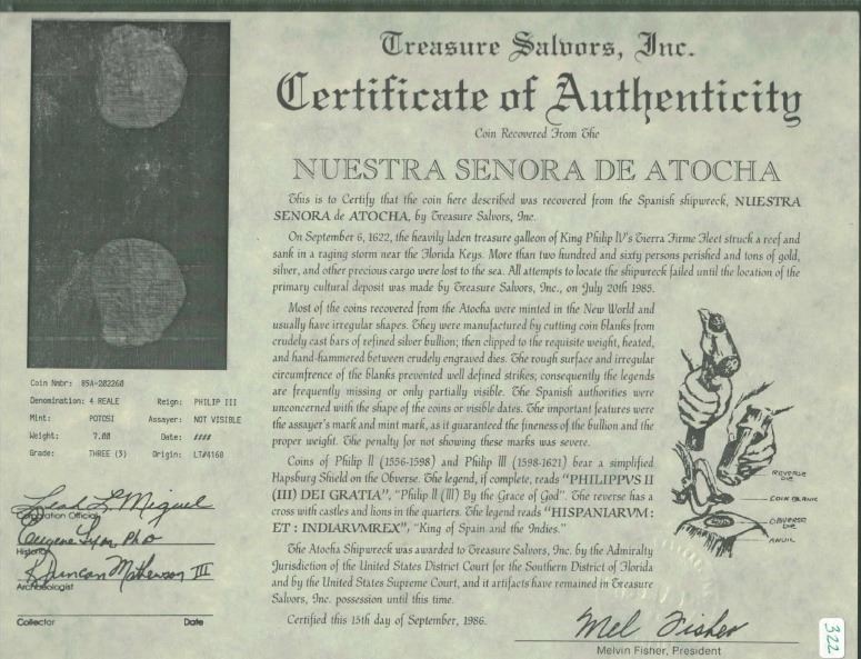 *** NOTE: Any stated "replacement" certificates are not authorized by Mel Fisher's Treasures. Any stated "Fisher tags" refer to printed insert cards (usually barcoded) and not original plastic tags. Any stated "Grade quality" in conflict with the Grade in the Fisher database or on a Fisher certificate is given as our own opinion about quality and does not imply that Mel Fisher's Treasures will or should upgrade the coin to that Grade. By ruling of the United States District Court for the Southern District of Florida in Admiralty, Mel Fisher's Treasures is the only entity authorized to (1) authenticate that a coin has been recovered from the Atocha, and (2) assign Grades to coins recovered from the Atocha. ***
