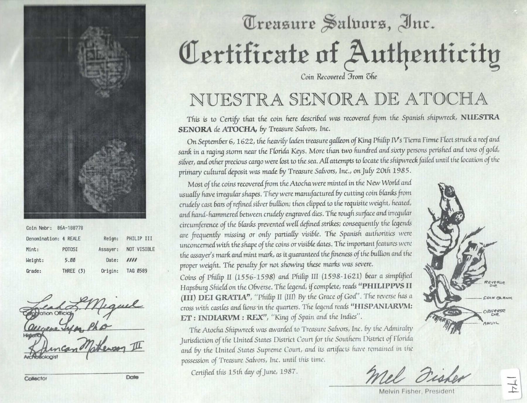 Potosi, Bolivia, cob 4 reales, Philip III, assayer not visible, Grade 3. KM-9. 5.12 grams. Thin and somewhat fragmentary but with choice full shield and toned in crevices. With original Fisher tag and certificate 86A-188778, pedigreed to the J.P. Silberman Estate.Recovered from: Atocha, sunk in 1622 west of Key West, Florida.