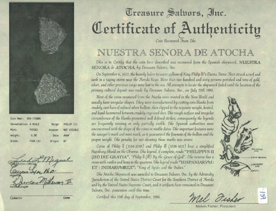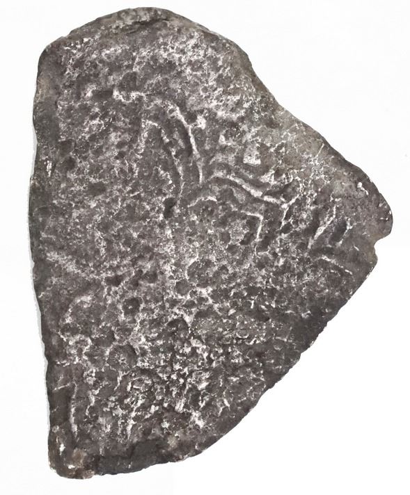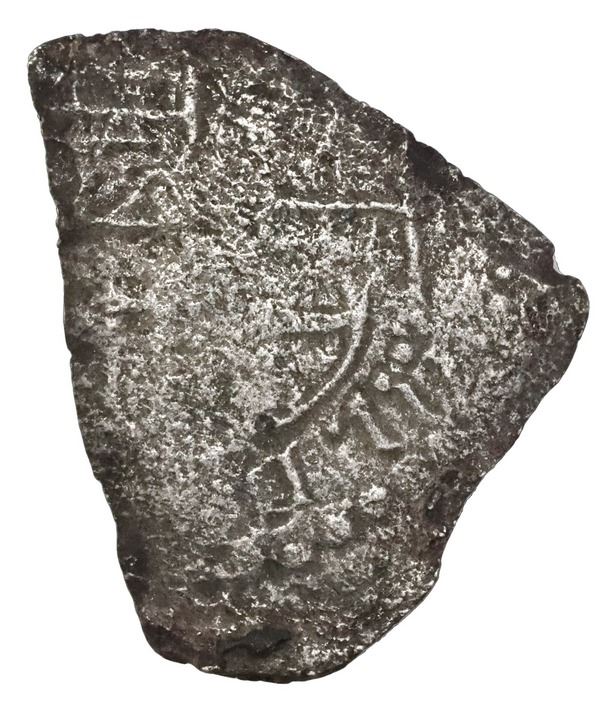 Potosi, Bolivia, cob 4 reales, Philip III, assayer not visible, Grade 4. KM-9. 5.26 grams. Triangular flan due to edge-loss, also much surface corrosion but with shield and cross both still recognizable, darkly toned all over. With Fisher tag and certificate #176004. Recovered from: Atocha, sunk in 1622 west of Key West, Florida