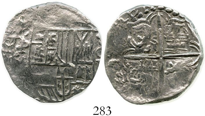 Potosi, Bolivia, cob 4 reales, Philip III, assayer not visible, quadrants of cross transposed, Grade 1. KM-9. 13.1 grams. Round flan with good full cross and shield (off-center), no corrosion but some flat spots. With Fisher insert-card #190903 (no certificate). From the Atocha, sunk in 1622 west of Key West, Florida