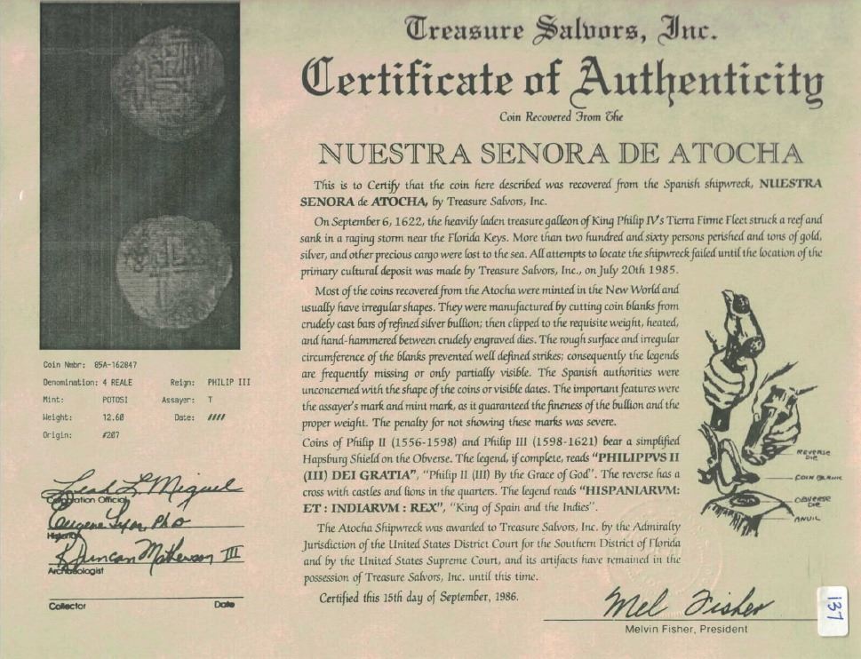 Potosi, Bolivia, cob 4 reales, Philip III, assayer not visible, quadrants of cross transposed, Grade-2 quality (no Grade on certificate). KM-9. 12.65 grams. Minimal corrosion, good full shield and cross (the latter double-struck), lightly toned. With Fisher tag and certificate #162847. Recovered from: Atocha, sunk in 1622 west of Key West, Florida