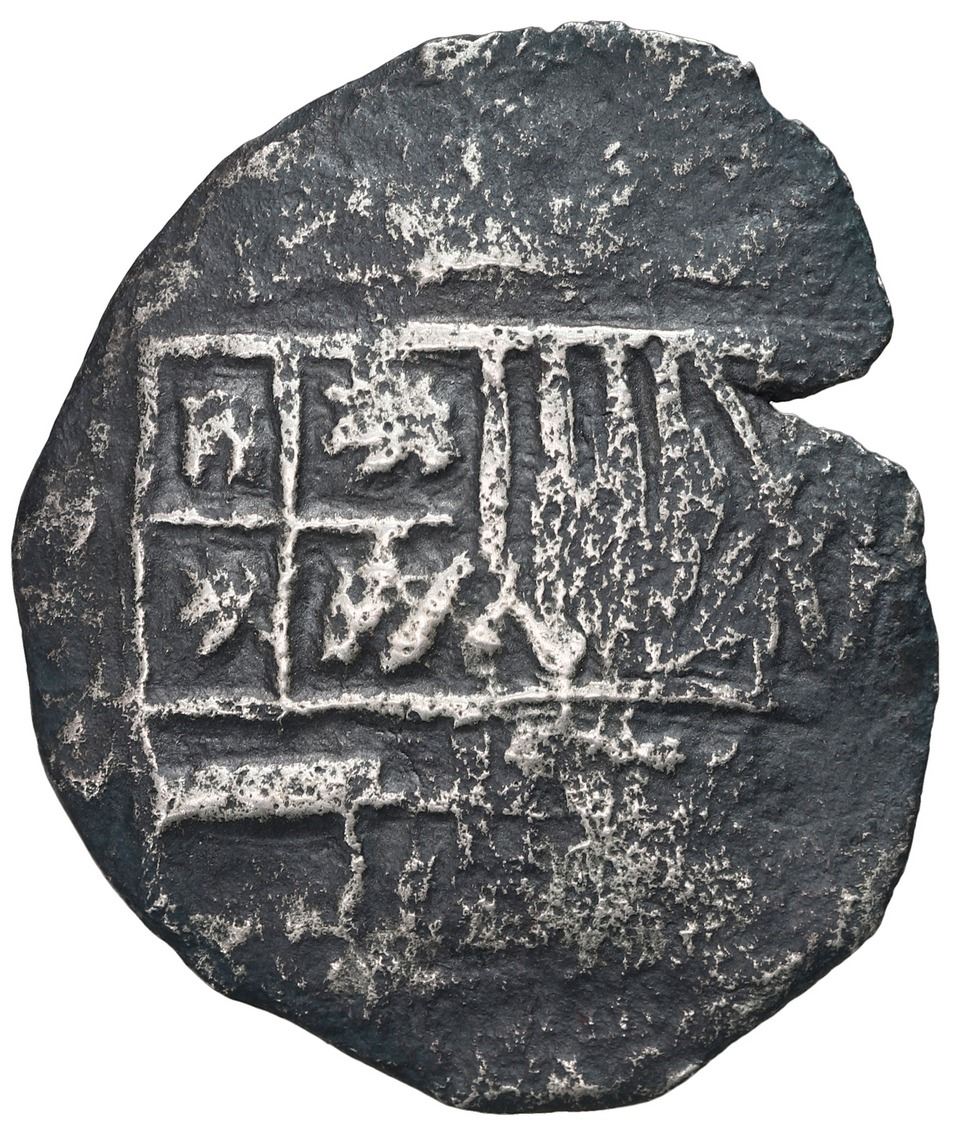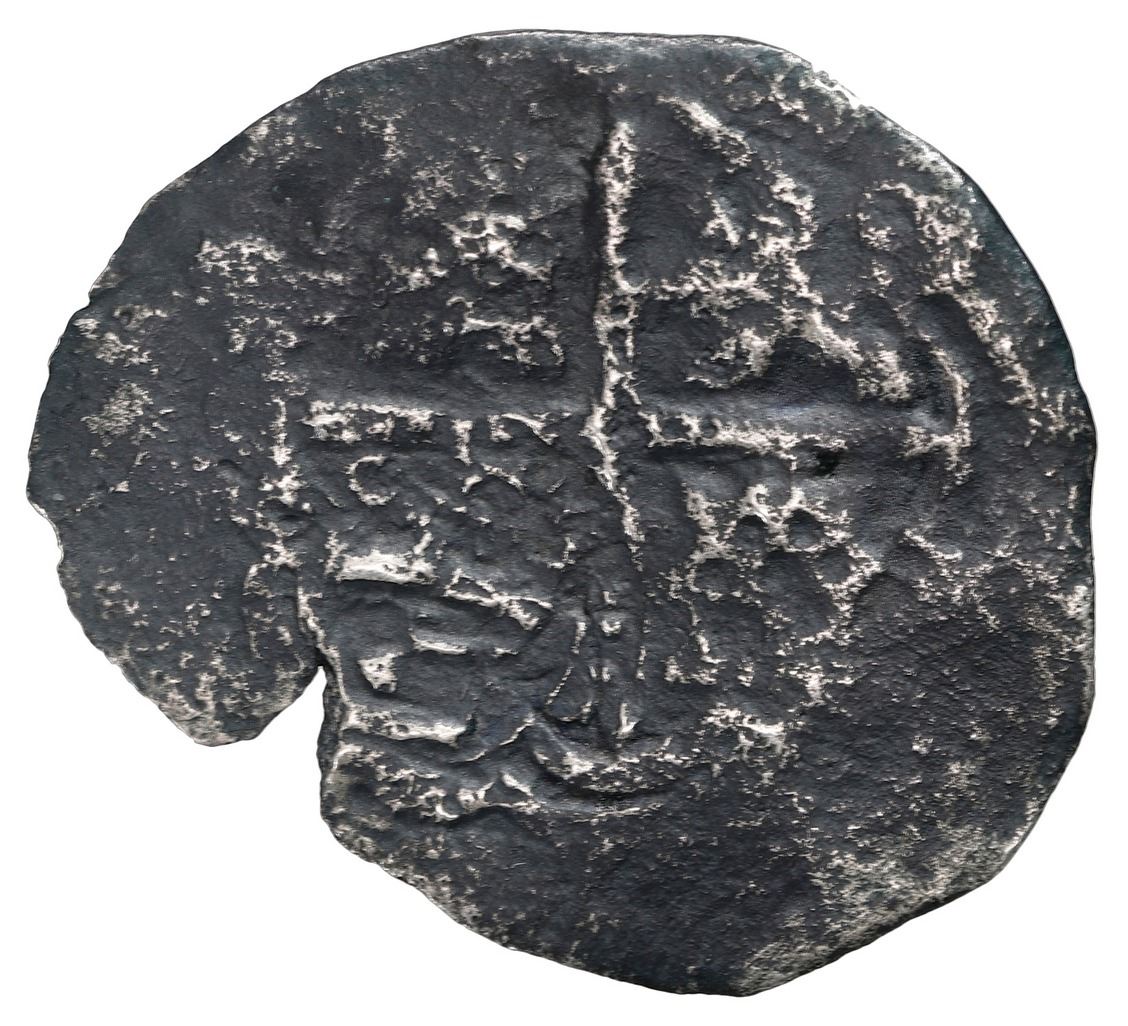 Potosi, Bolivia, cob 4 reales, Philip IV, assayer O, with crowned-? countermark on cross. S-P35; KM-17b. 7.35 grams. Dark and thin due to saltwater immersion, bold partial shield, some cross and countermark detail yet the full countermark obscured. Recovered from: Capitana, sunk in 1654 off Chanduy, Ecuador.