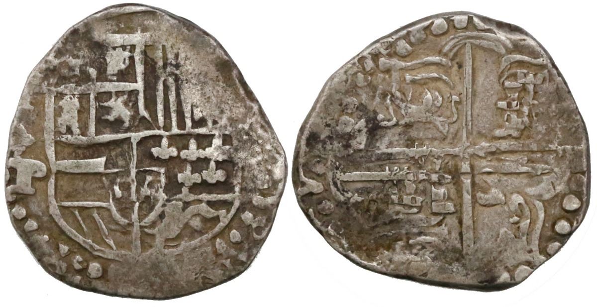 Potosi, Bolivia, cob 4 reales, Philip IV, assayer P/T (1622), quadrants of cross transposed, rare. S-P23; KM-17. 13.49 grams. Bold P/T, good full shield, full but doubled cross, AVF with toning and sediment on fields.