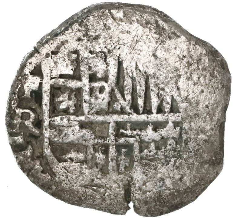 Potosi, Bolivia, cob 4 reales, Philip IV, assayer R (Ramirez, 1646-8), extremely rare. S-P31; KM-17a; Cal-unl (Type 279). 10.39 grams. Nearly full shield and cross (peripherally flat) with bold full P-R to left (one of very few examples still in existence, as scandalous assayer R's coins were mostly melted), with edge-split and light surface corrosion but not enough to account for such a low weight (probably debased), otherwise Fine, with brown sediment in crevices.