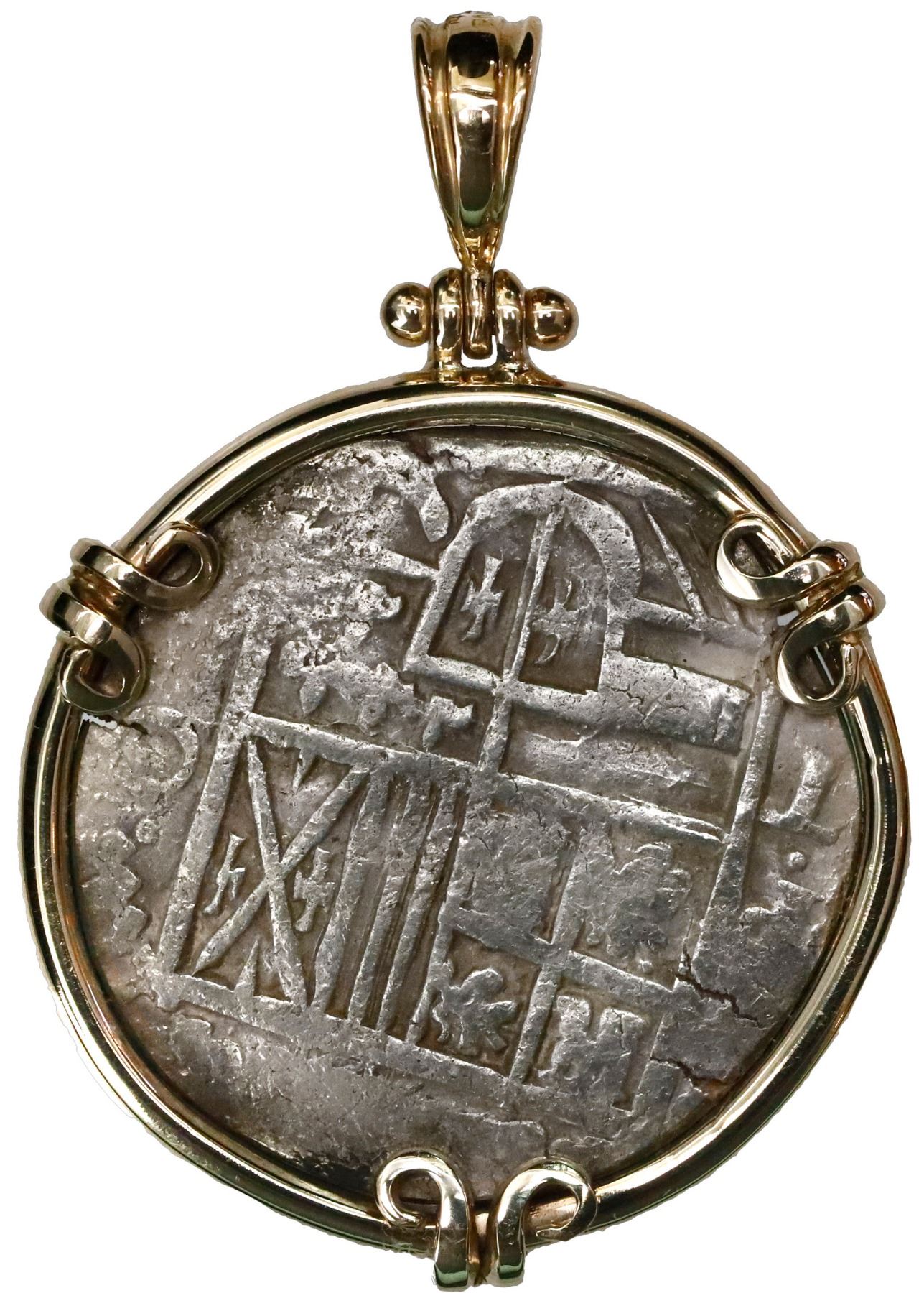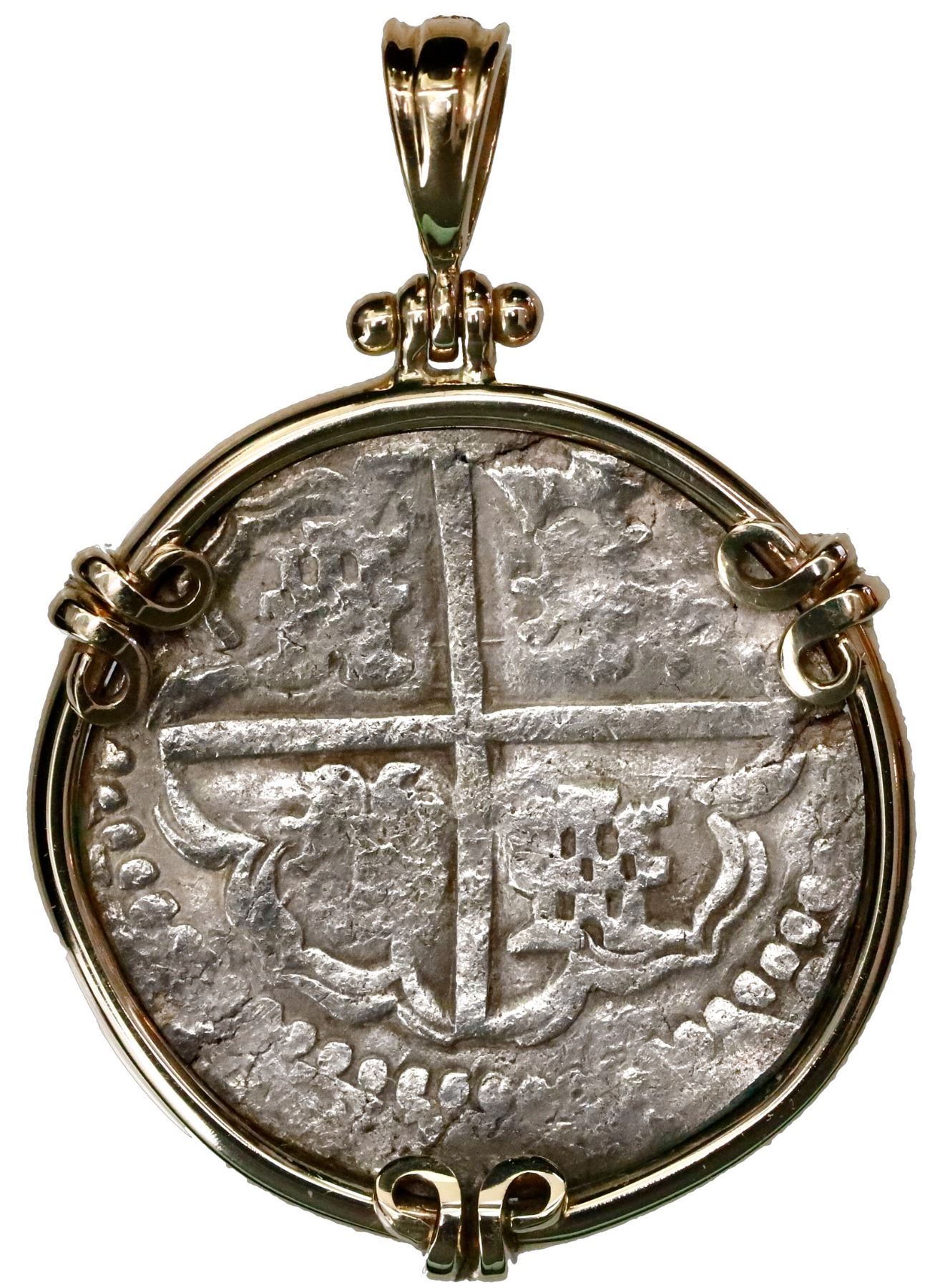 Potosi, Bolivia, cob 4 reales, Philip IV, assayer T, mounted cross-side out in 14K gold pendant with shackle bail. 22.20 grams total. Very attractive setting of a mostly round coin, perhaps lightly rounded on edge to fit the custom gold bezel, with three ornate prongs, cross and shield visible but cross side slightly off-center.