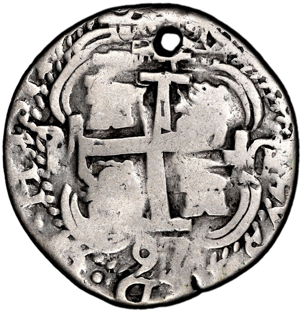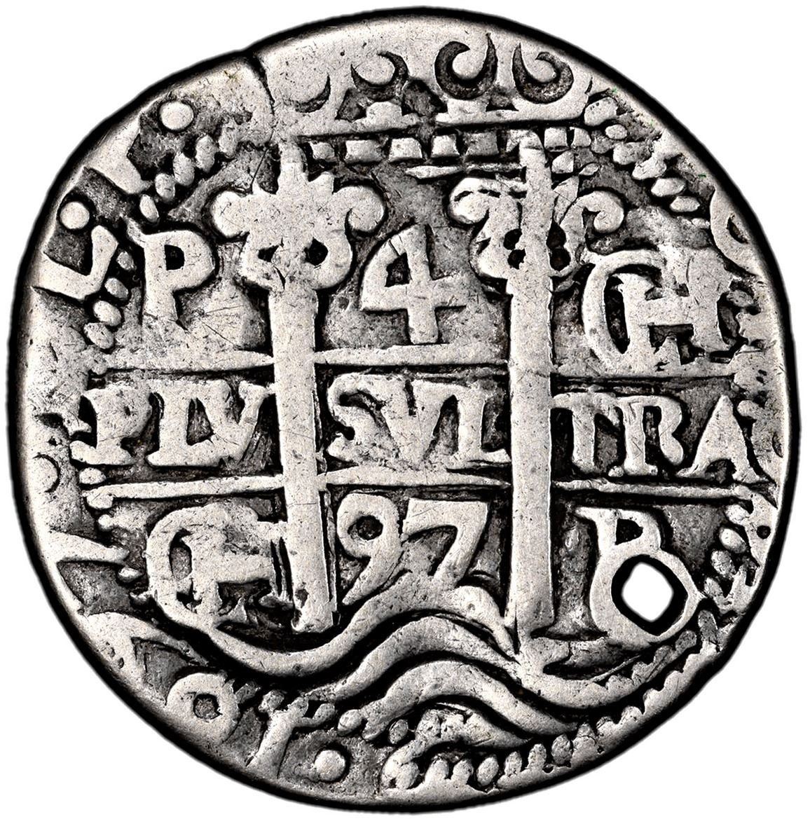 Potosi, Bolivia, cob 4 reales Royal (galano), 1697 CH, extremely rare, PCGS VF details / holed, finest and only example in any census, ex-Pat Johnson. S-P41; KM-unl; Cal-505. 12.17 grams. Choice full pillars-and-waves with clear bottom of second date 1697 in legend, both assayers full and clear (an attractive monogram with H inside a large C), the cross side slightly doubled and a little more worn (perhaps in connection to being holed at the top of the cross, an old squarish piercing), but overall quite attractive (nicely toned) and probably unique, also probably struck from the same dies as the famous 1697 CH 4R Heart that hammered for $24,000 in 2008. It is also worth noting that no 8R Royals of assayer CH are known, so this is the largest denomination possible. Pedigreed to the Pat Johnson Collection.