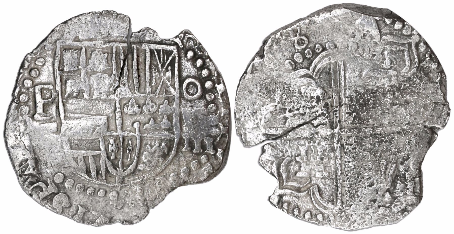 Potosi, Bolivia, cob 8 reales, (1)6(1)8T, variety with large mintmark and denomination as o-V-III, quadrants of cross transposed, Grade 2. S-P21; KM-10. 25.03 grams. Broad flan, unevenly thick, with choice full shield and clear mintmark (oversized) and denomination in three parts (scarce), bold 8 of date outside full but weaker cross, minimal corrosion but silvery and with edge-split. With Fisher/Sinclair certificate #198317. Recovered from: Atocha, sunk in 1622 west of Key West, Florida